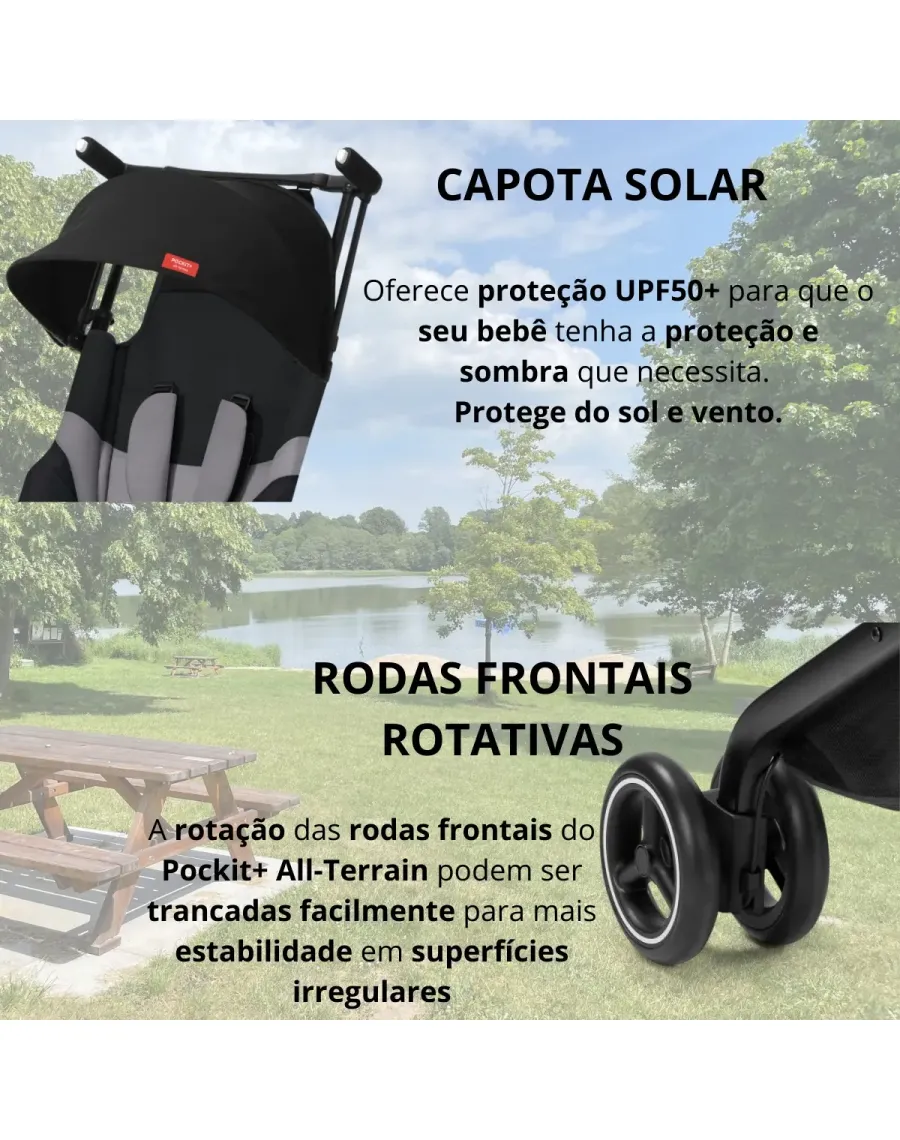 Características do Produto: Ultra compacto - Compacto e conveniente, o seu Pockit+ All Terrain pode ser fechado numa estrutura ultra compacto (20 x 34 x 42 cm) e arrumado em qualquer lado.