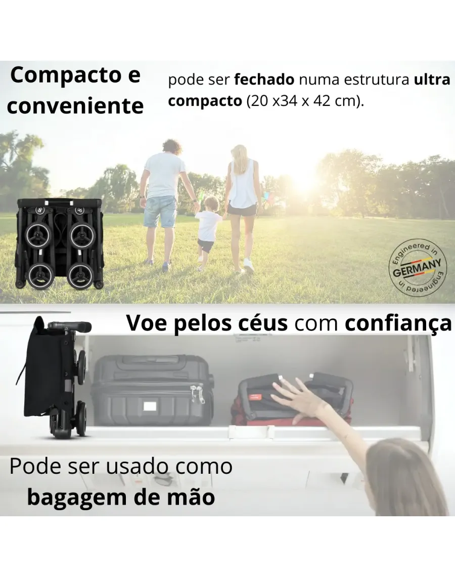 Com apenas duas etapas, o carrinho ultracompacto exclusivo é fechado para o tamanho de bagagem de mão, proporcionando a liberdade de sair e explorar o mundo, enquanto a capota solar oferece proteção adicional contra o sol e o vento.