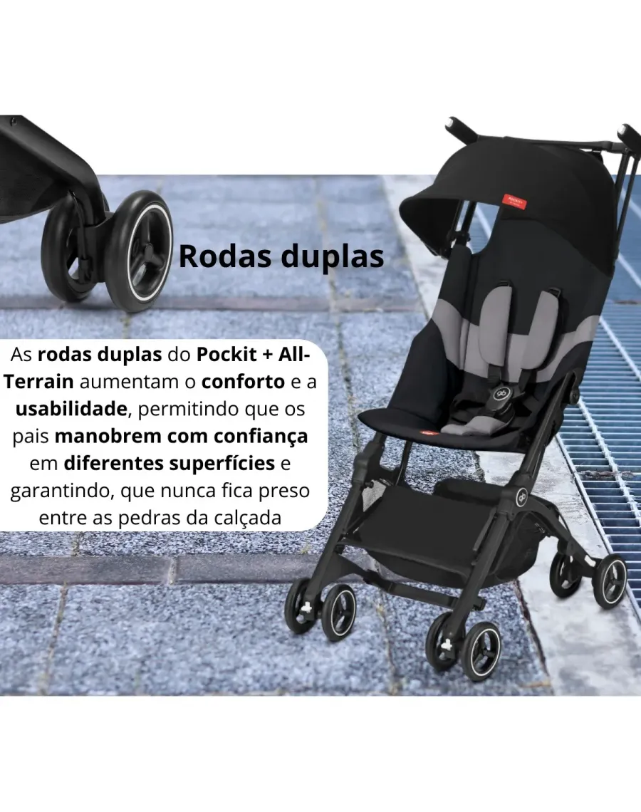 Rodas duplas todo o terreno - As rodas duplas do Pockit+ All Terrain aumentam o conforto e a usabilidade, permitindo que os pais manobrem com confiança em diferentes superfícies e garantindo, que nunca fica preso entre as pedras da calçada.