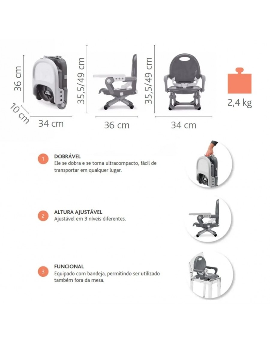 Uma solução simples para qualquer situação fora de casa. Assento elevatório prático, compacto e simples. O Pocket Snack permite que a criança se sente à mesa com a mãe e o pai durante uma noite em uma pizzaria, faça um brunch no domingo ou almoce fora de casa. Assento confortável ideal para bebês de 6 a 36 meses de idade. O Pocket Snack se ajusta a uma cadeira em diferentes alturas, permitindo que a criança se sente na altura certa e se adapte aos diferentes estágios de seu crescimento.